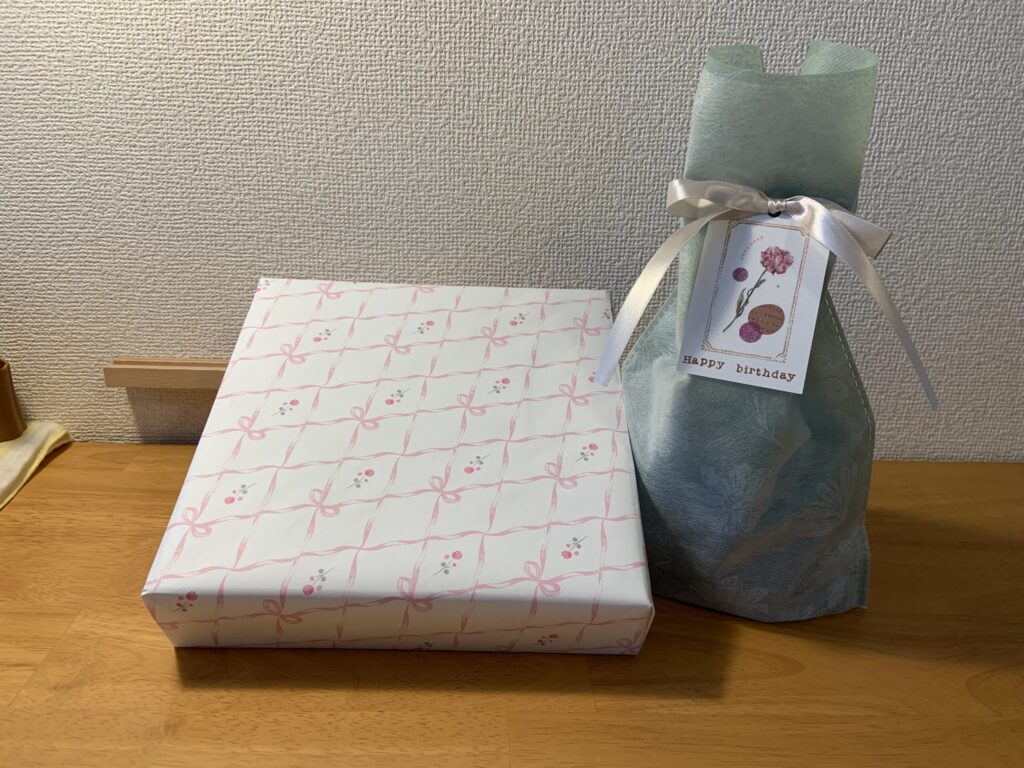 ちなみにこちらは「DAISO」のラッピングシートとギフトラッピングを使用しました。せっかくなのでラッピングも自分でやってみました。なかなか綺麗にできました。