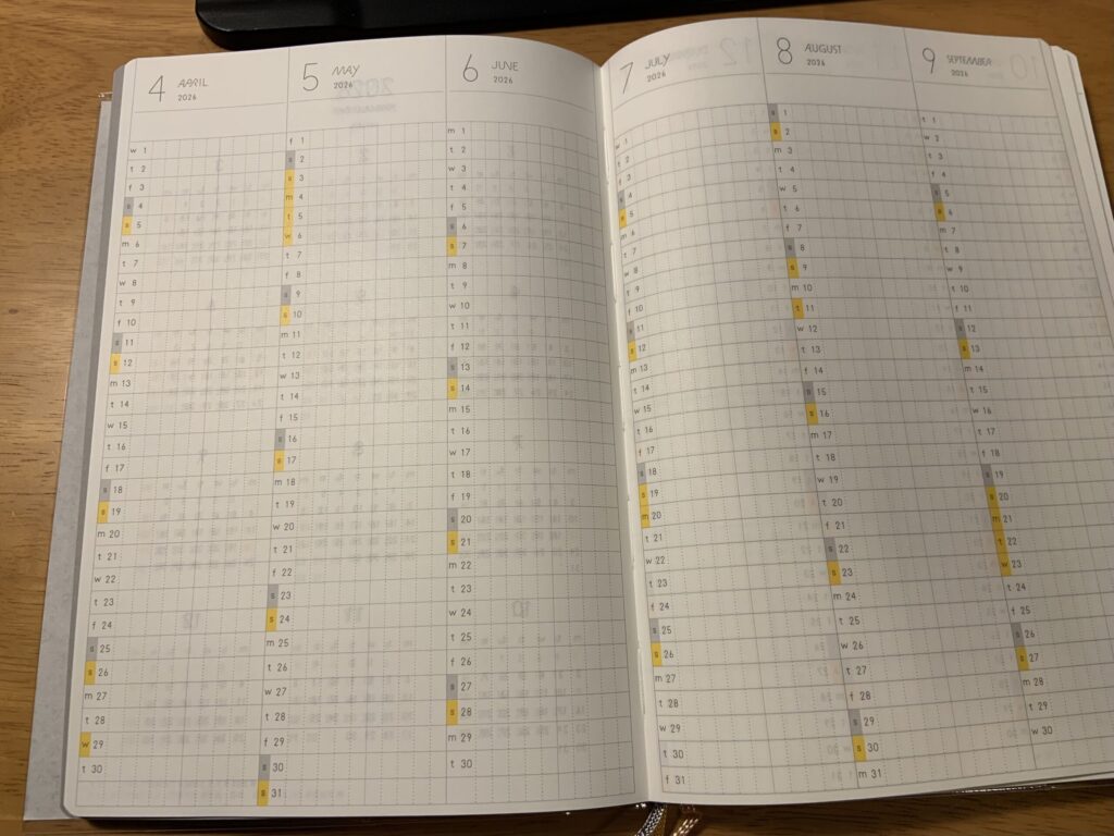 まず開くと、年間カレンダー(2028年まで)と1年を半年ずつ俯瞰できる年間フォーマットがあります。月の下にはスペースがあり、その月の目標など書くこともできます。また、マス目で区切られているので、体調管理やハビットトラッカーとしても活用できそうです。