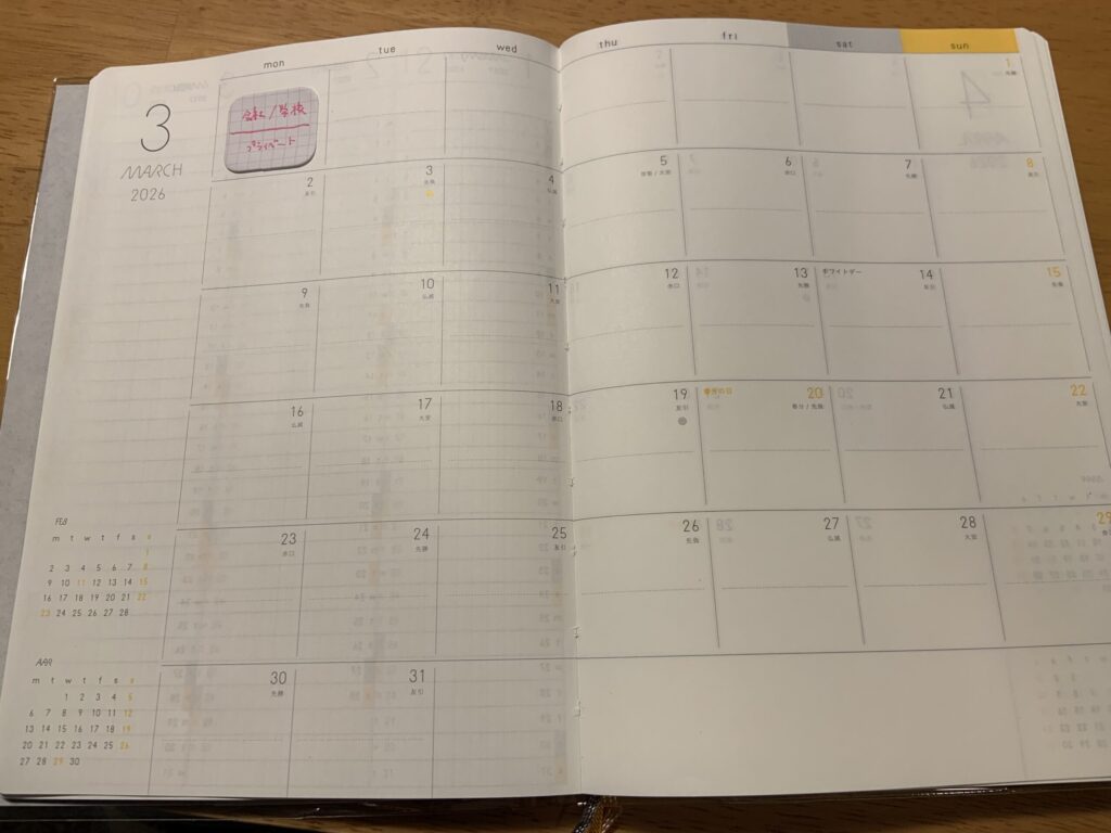 お次はマンスリーページです。1マスを上下に区切る中央線があるので、仕事や学校/プライベートを分けてスケジュール管理できそうです。午前と午後に分けても良さそうですね。