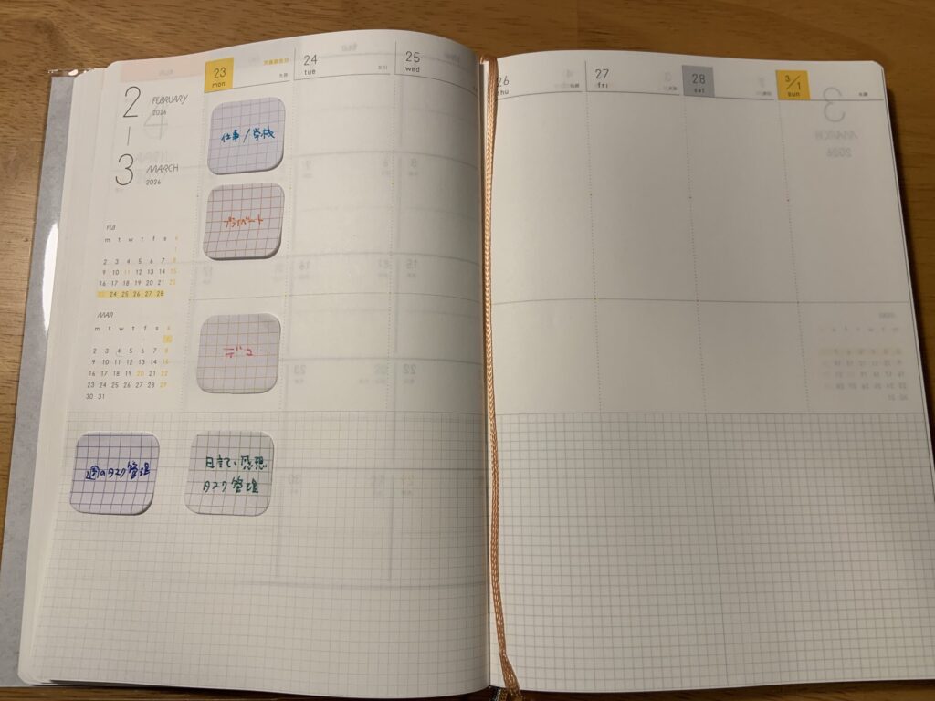 現在私は、他社のマンスリー手帳を使用して、日々、手帳デコの練習をしいいるところなのですが、書き込みたい予定や日々のジャーナルが増えてきたので、4月からはこちらのウィークリー手帳で日々のタスク管理をしたりバレットジャーナルをまとめたいと考えています。