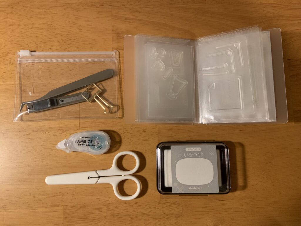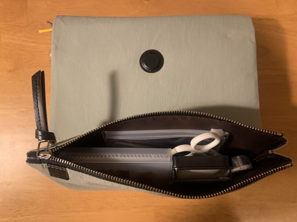 たっぷり入るファスナーポケットには、テープのりと「無印」で購入したハサミ、ファスナー付きケース(無印)、ケースの中には、細かい作業に便利なピンセットや小さなカッター(無印)、クリップなどを収納しています。右側の小さなクリアファイルも「無印」のもので、お気に入りのクリアスタンプやマスングテープを収納しています。