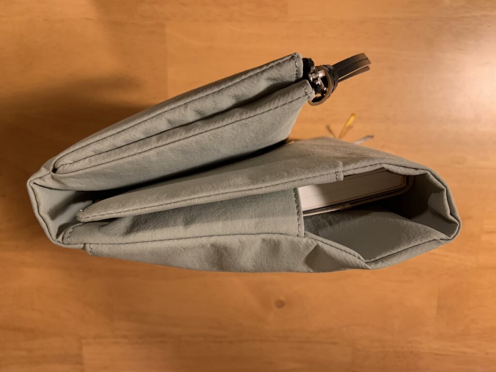 外側の大きなポケットにはカッターマット(DAISO)とクリアスタンプ台(seria)、お気に入りのシャチハタさんのドーナツ型のインクパッドを収納しています。カッターマットはあまり出番がないのでいらないのかもしれませんが、小さくて嵩張らないので持ち歩いています。