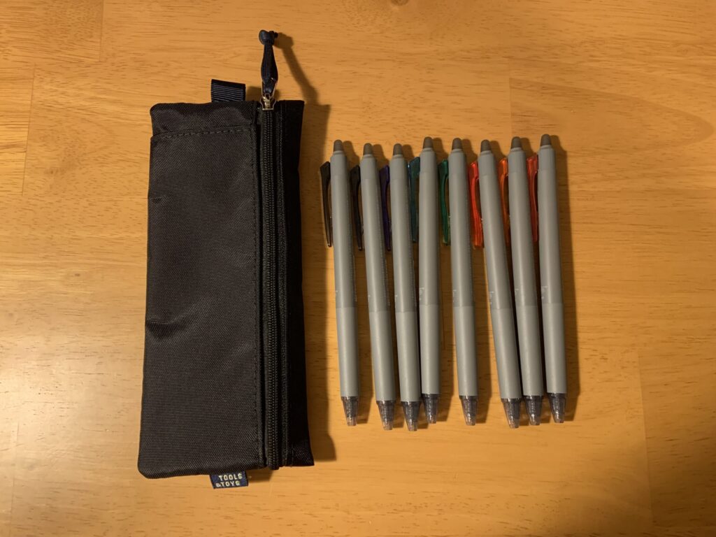 そして、「tragen」とは別に、同じくほぼ日手帳さんのフラットペンケース「comodo」に大好きなフリクションペンの0.5㎜8色セットを収納して一緒に持ち歩いています。