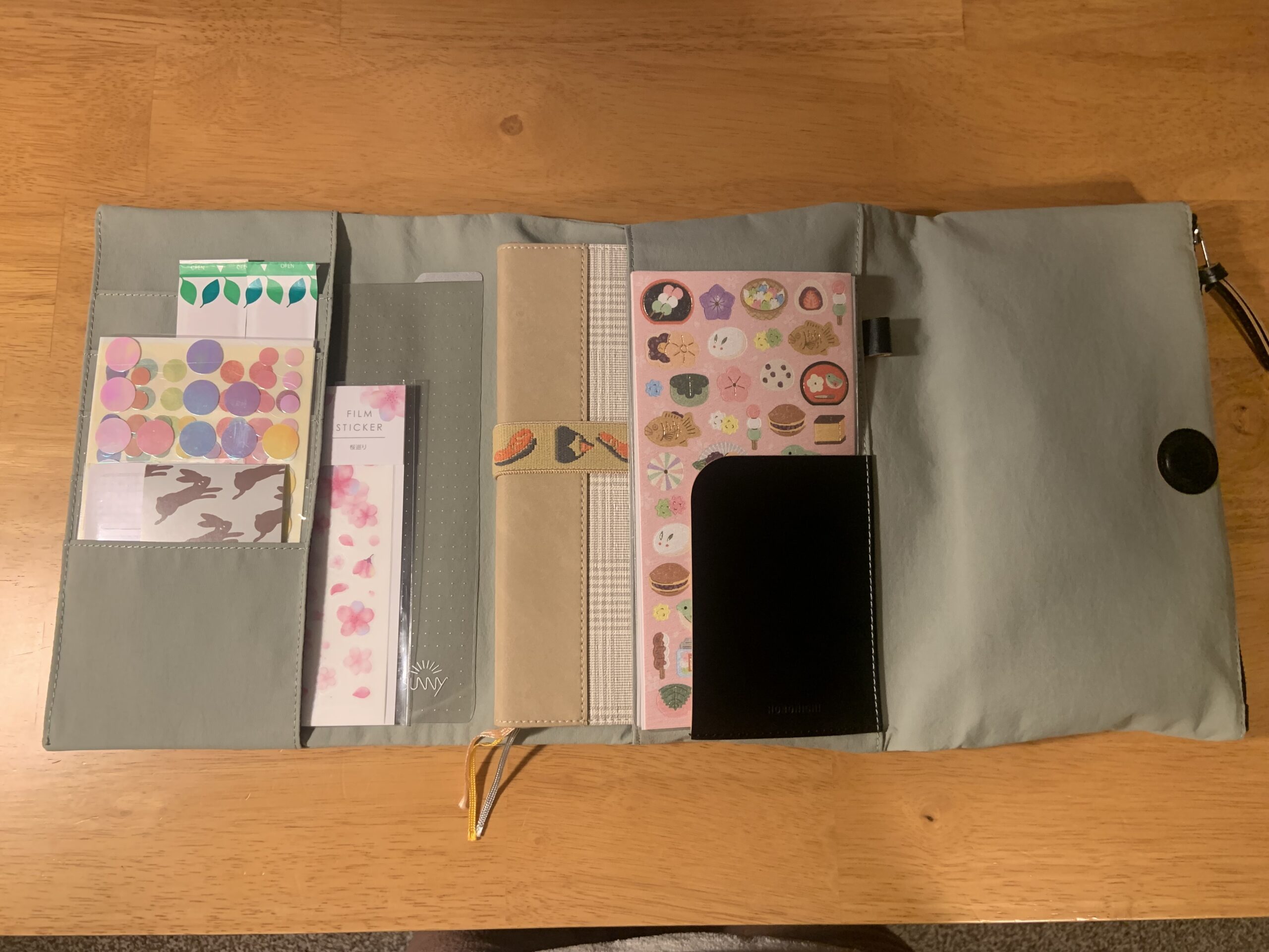 現在はこんな感じで収納しています。左側の小さなカードポケットには、シールや付箋などを(ケアリーブも忘れずに)。